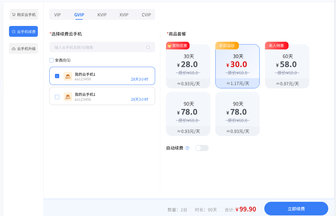 如果要续费云手机,需选择“购买/续费/升级”模块,点击云手机续费,选择您的云手机型号,再选择您要续费的套餐,选择支付方式,即可成功续费您的的云机。