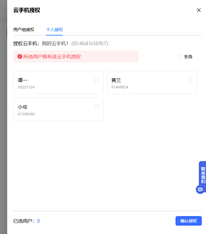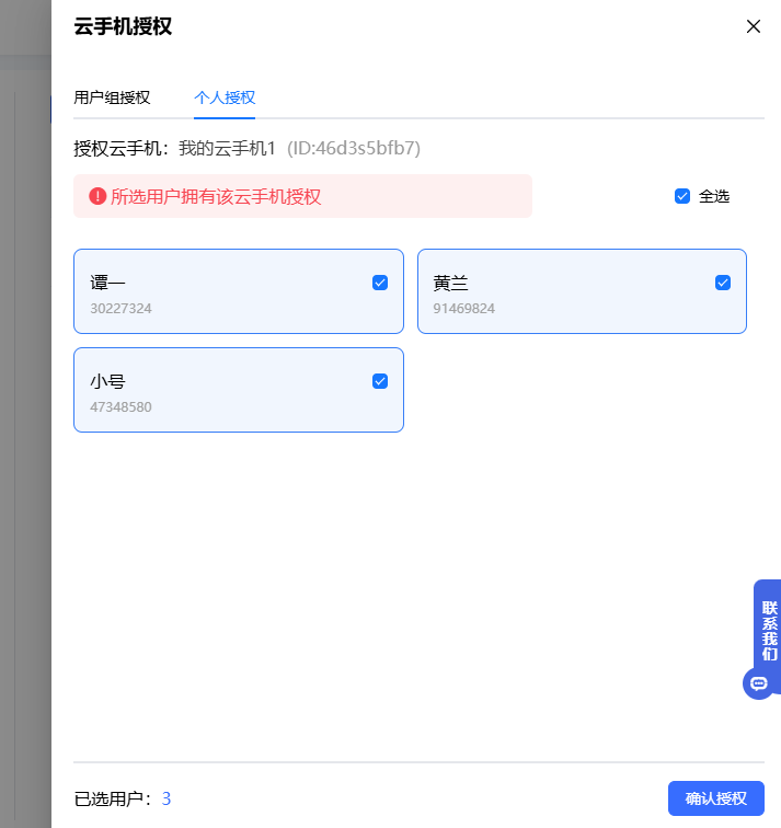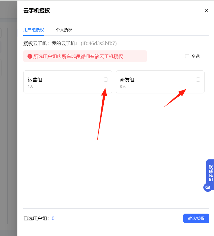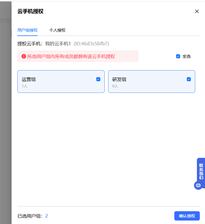 一台云机可以同时授权给多个用户组,用户组内所有成员都将拥有该云手机。