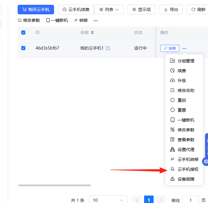 将需要授权的云手机选中,点击…再点击 “云手机授权”按钮进行授权。