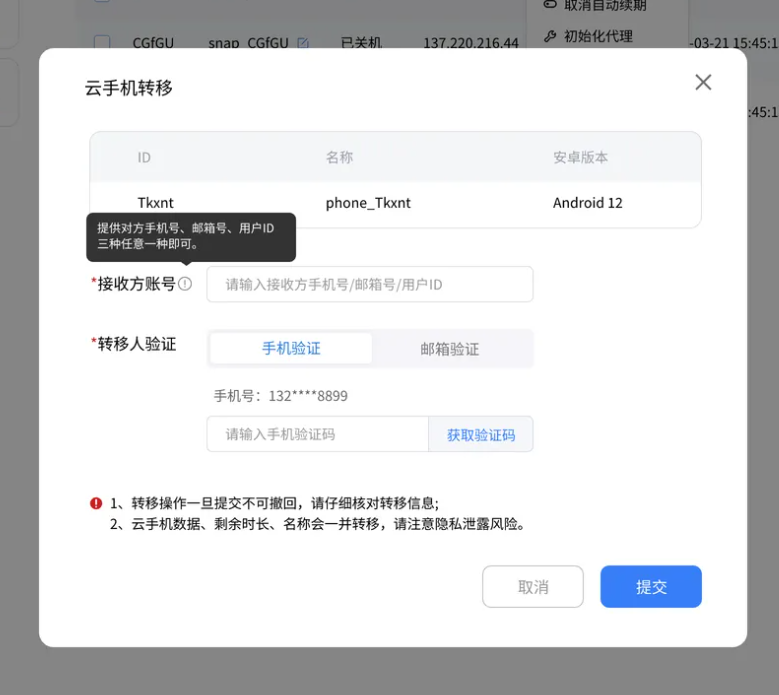 注意:云手机转移成功后,无法撤销,请仔细核对转移信息。
