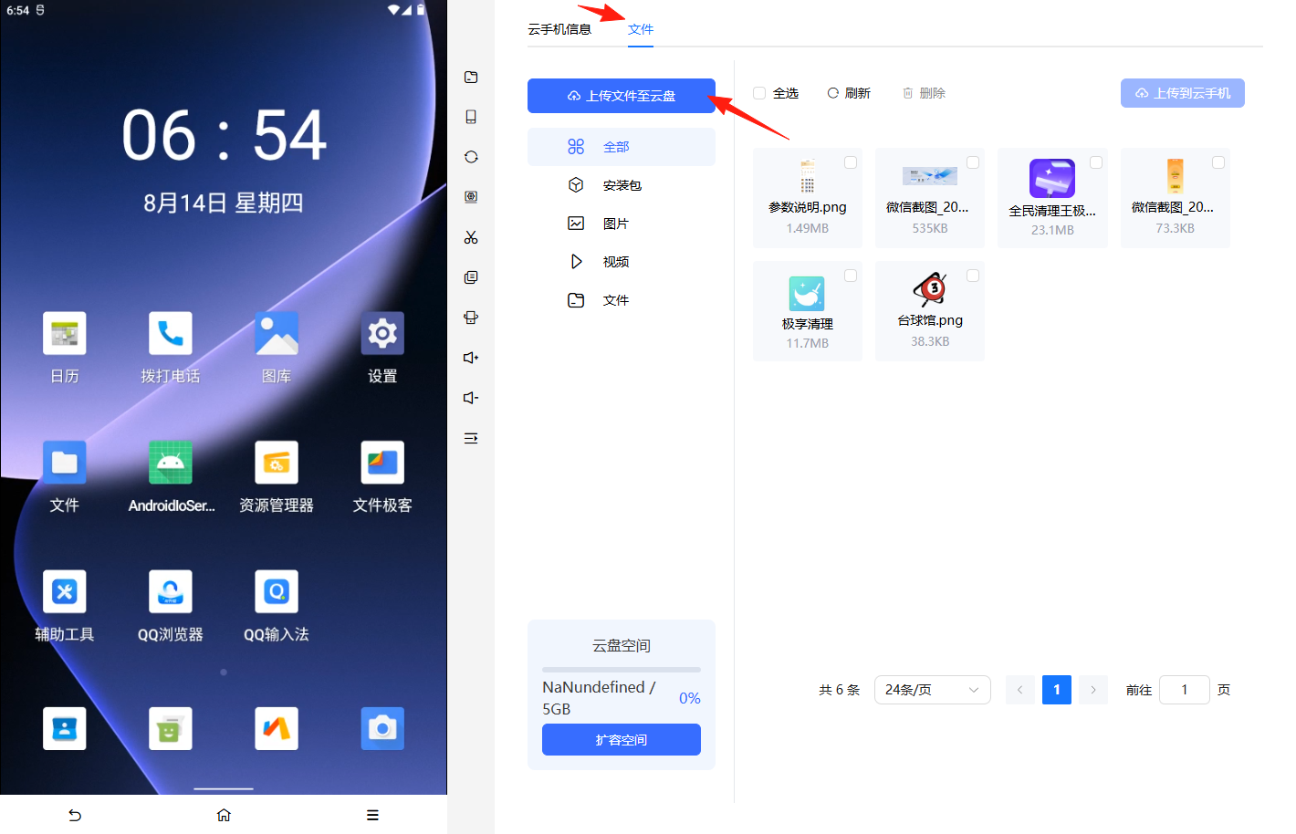 1、 切换到文件,先将本地的应用上传到云盘。