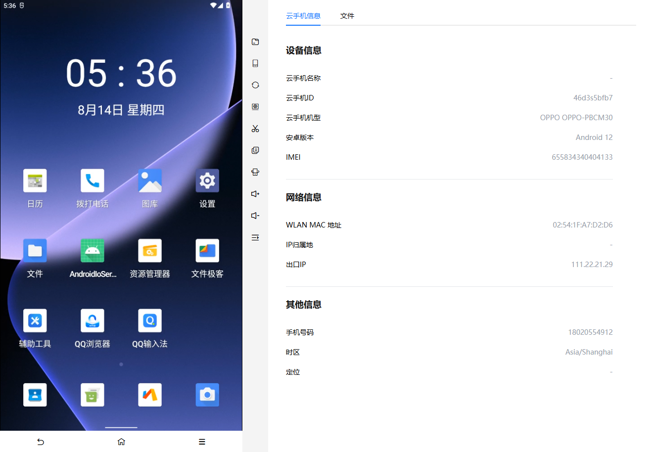 左侧展示的是云机投屏画面及云机相关操作按钮,右边展示的是云手机信息、云盘文件信息。